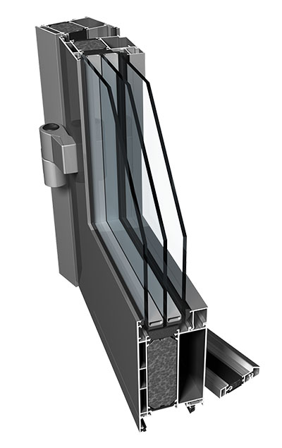 Trzykomorowy system izolowany termicznie przeznaczony do wykonywania konstrukcji drzwiowych.